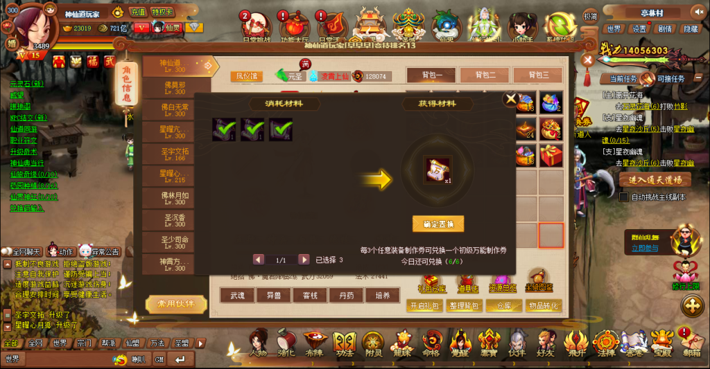 2.用于制作装备的杂物可3:1转化为神炼石,每日限制转化300次