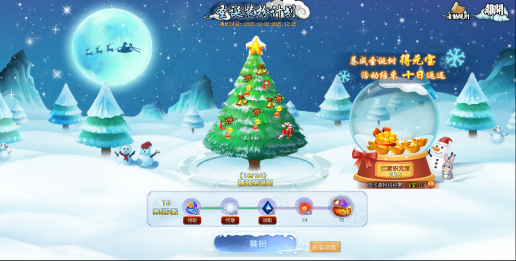 1.活动期间,等级达到30级开启,所有玩家可获得1颗小圣诞树开始培育